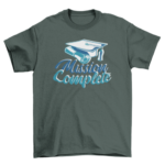 T-shirt design featuring a graduation hat and the text MISSION COMPLETE.