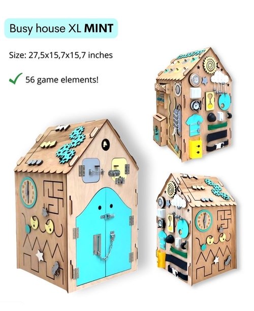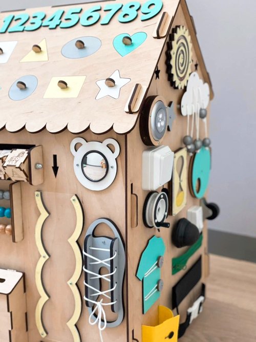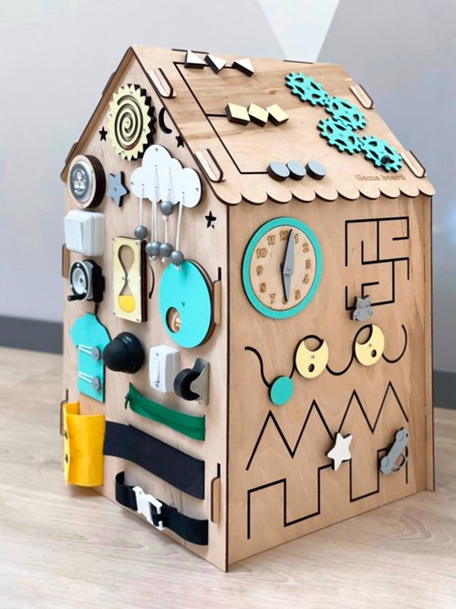 Busy Board house includes elements designed for different ages of child development. Some elements will be easy for one–year–olds while others aredesigned for children ages two and up. Thus, the toy “grows” with your child, since he/she always discovers something new!